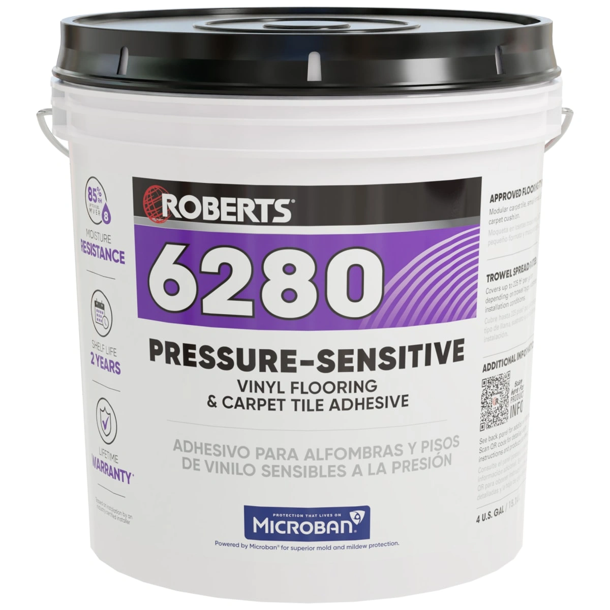 ROBERTS® 6280 Pressure Sensitive Releasable Multi-Flooring Adhesive is an acrylic latex, solvent-free adhesive formulated for installation of modular carpet tile, small-format LVT (up to 16″ x 16″) carpet cushion, and fiberglass-backed sheet vinyl. Powered by Microban®, this antimicrobial product protection helps fight the growth of stain and odor-causing bacteria that can cause product degradation. For use on concrete, APA-rated plywood, and terrazzo substrates in interior installations, ROBERTS 6280 is an enviro-friendly, solvent-free adhesive with a low VOC:< 1 g/L. Made in the USA, it offers a Limited Lifetime when installed by Certified Flooring Professional.