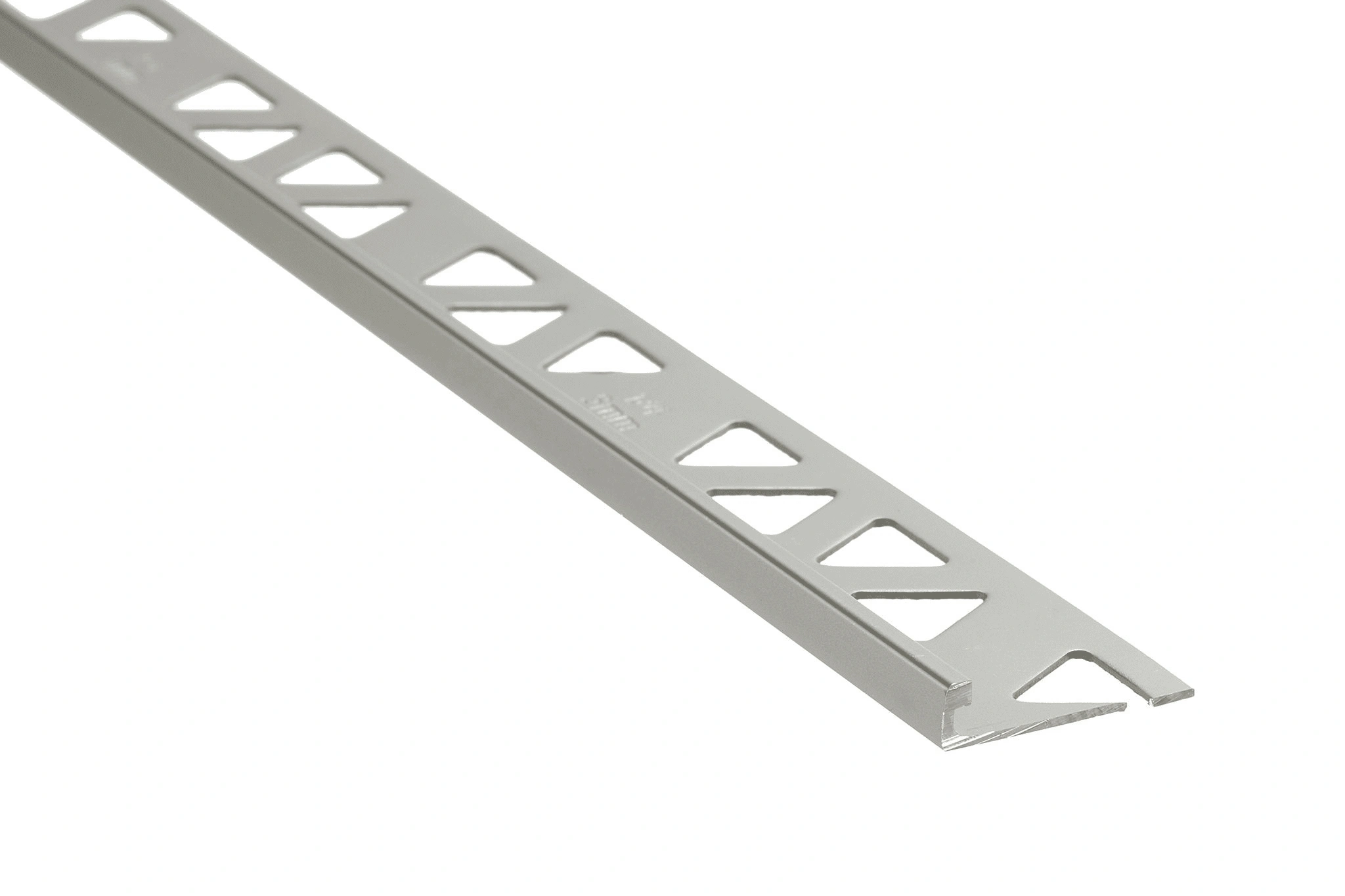 Individual stick of 3/8″ metal flat tile edge in color Satin Clear. 8 feet per stick.